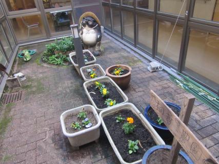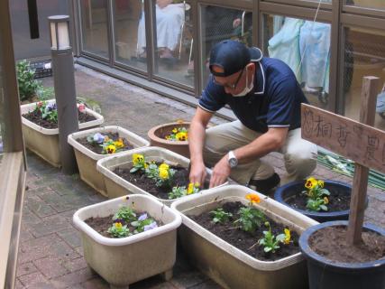 にパンジーやなでしこ、マリーゴールドを入園者さんが見守る中、植え