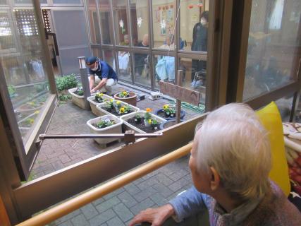 にパンジーやなでしこ、マリーゴールドを入園者さんが見守る中、植え
